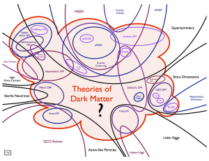 Quand on regarde la courbe de rotation des galaxies, on se rend compte que les étoiles périphériques ont une vitesse trop importante pour être expliquée par la loi de gravitation, comme elle est comprise aujourd’hui. Alors, depuis presqu’un siècle on a fait l’hypothèse d’un halo de matière autour d’une galaxie que l’on appelle matière noire. Elle a été approximée à être 5 fois plus grande quantitativement que la matière ordinaire.